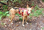 LASSIE geht schon gut an der kurzen Leine, und auch am Geschirr mit Schleppleine funktioniert es draußen schon sehr gut.