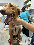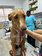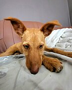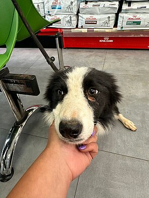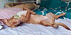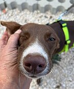 Ihr Augenlid wurde vor langer Zeit bei der Jagd verletzt und damals auch operativ versorgt; wir werden aber nun noch einmal nacharbeiten lassen, damit die Lidspalte geschlossen werden kann und die Nickhaut nicht dauerhaft frei liegt. Derzeit braucht Careta täglich Augentropfen.