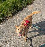 Auf Spaziergängen ist sie neugierig, geht selbstsicher durch die Welt und lässt sich nicht besonders irritieren. Sie geht schon sehr schön an der Leine ohne zu ziehen und behält ihren Menschen dabei meist im Blick.